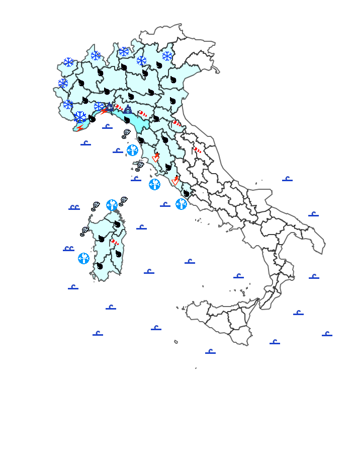 Precipitazioni: sparse su Liguria, Valle d'Aosta, Piemonte e settori occidentali della Sardegna, in estensione al resto della Sardegna e a Lombardia, Emilia, Appennino romagnolo, Trentino, Veneto centro-meridionale, Toscana e alto...